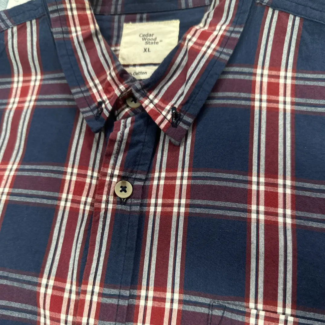Soft Cotton Fabric: The label indicates it is made from cotton, and the texture suggests a soft, comfortable flannel, perfect for casual wear in cooler weather.Button-Down Collar: The traditional button-down collar gives it a neat, classic look.Contrasting Buttons: The shirt has dark, cross-stitched buttons that add a subtle touch of detail.Size: The label clearly shows it is a size XL.