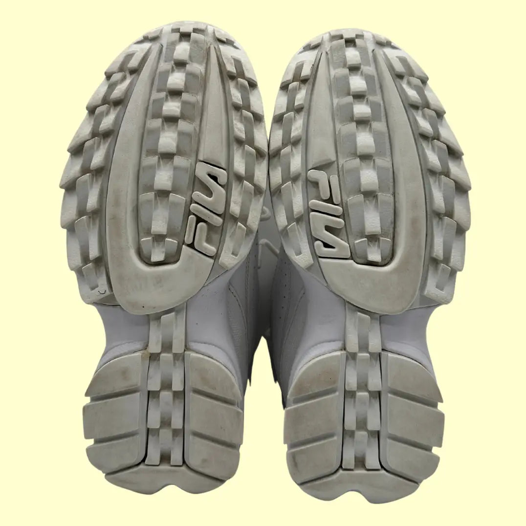 Preloved authentic Fila chunky sneakers in white, featuring a sturdy EVA/rubber sole and a leather/synthetic upper. Comfortable, durable, and perfect for casual everyday wear. Visible signs of use but still in good wearable condition.