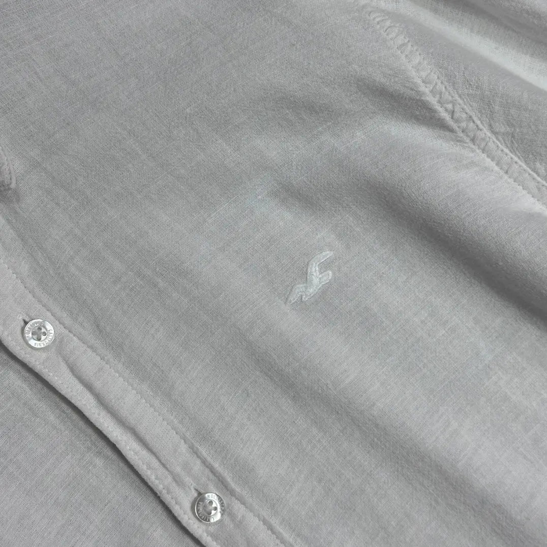 A premium Hollister California long-sleeve shirt in a clean white shade, featuring a lightweight linen-blend fabric and the iconic embroidered seagull logo. Slim fit, breathable, and perfect for summer, layering, or casual smart looks. A stylish essential for every wardrobe.