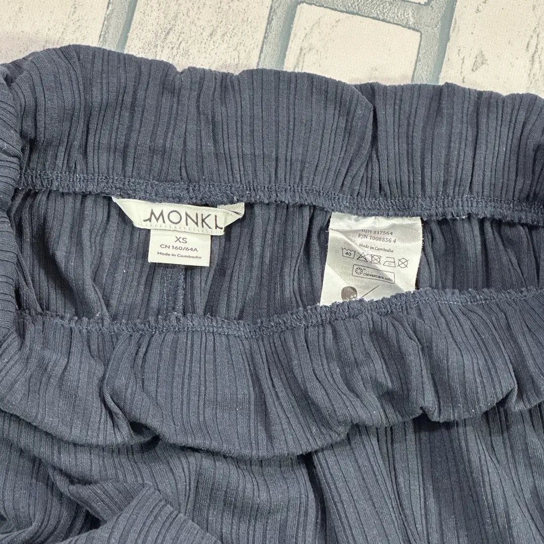 uffled elastic waistband, wide-leg silhouette, ribbed fabric