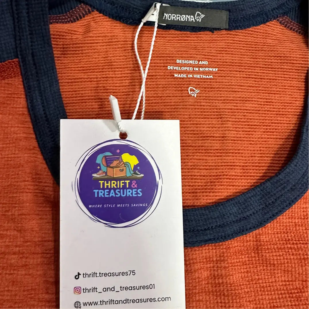 A premium Norrøna performance T-shirt featuring a burnt-orange body with contrasting navy raglan sleeves. Lightweight, breathable, and ideal for outdoor activities, gym sessions, or everyday comfort. Original Norwegian design made to last.