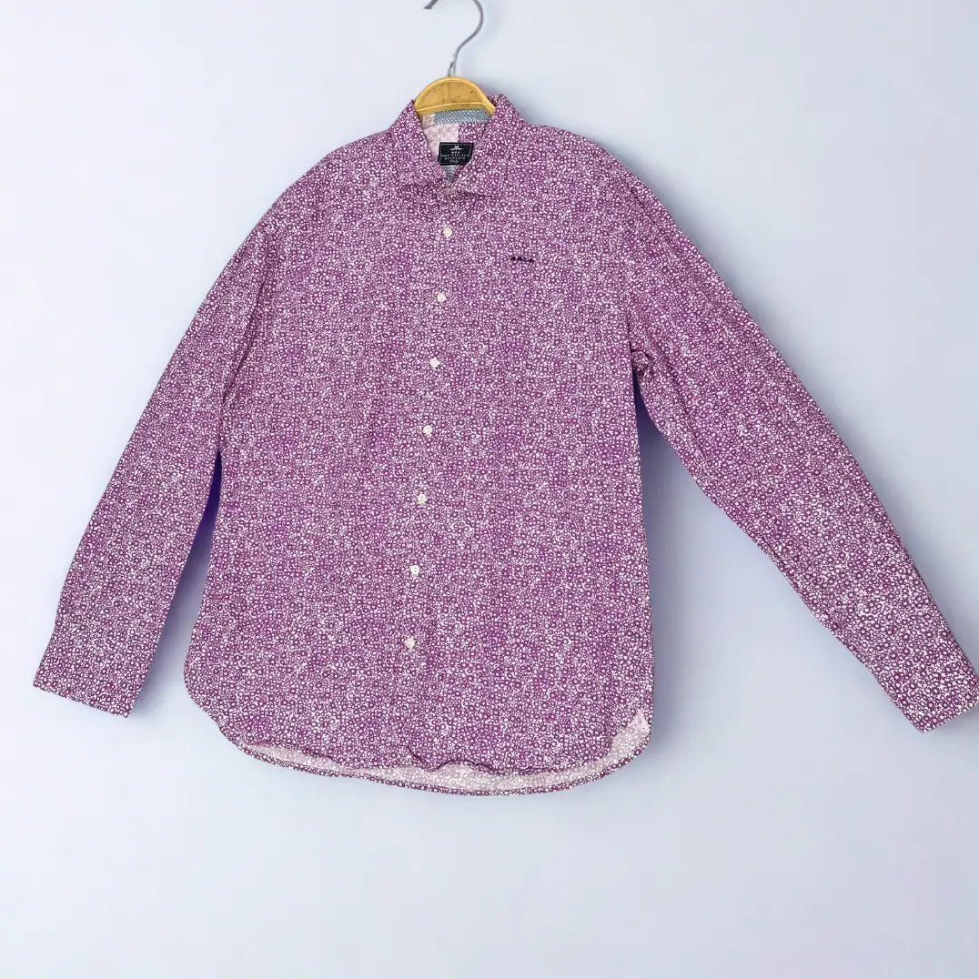 Distinctive Pattern: A striking all-over floral or abstract micro-print in white on a rich purple or magenta background.Premium Details: The shirt features a small, black embroidered NZA fern logo on the chest and a contrasting blue textured fabric lining the inner collar, showcasing the brand's attention to quality.Quality Construction: It has a sharp, standard collar, contrasting white buttons, and is crafted from what appears to be high-quality, comfortable cotton.Fit: The label indicates it is a Regular Fit.