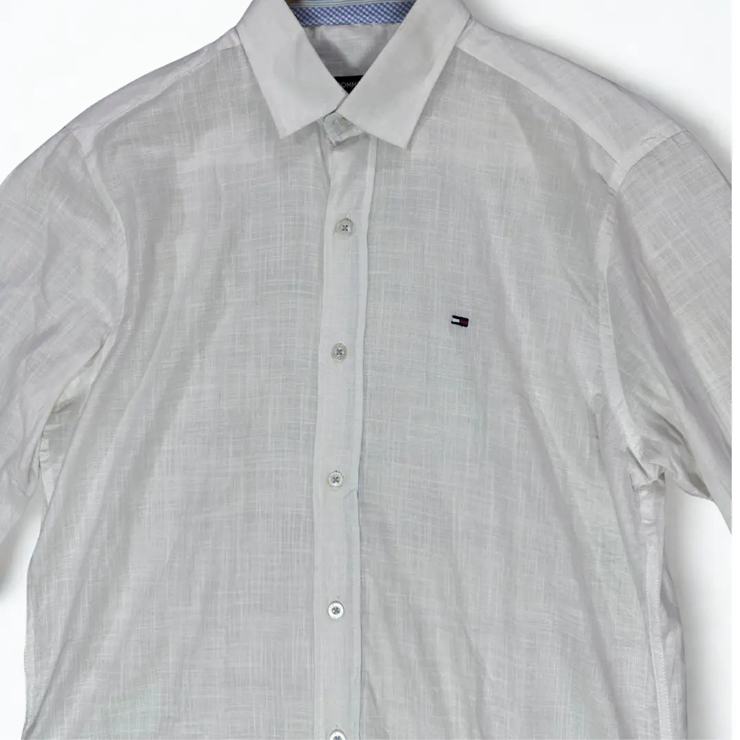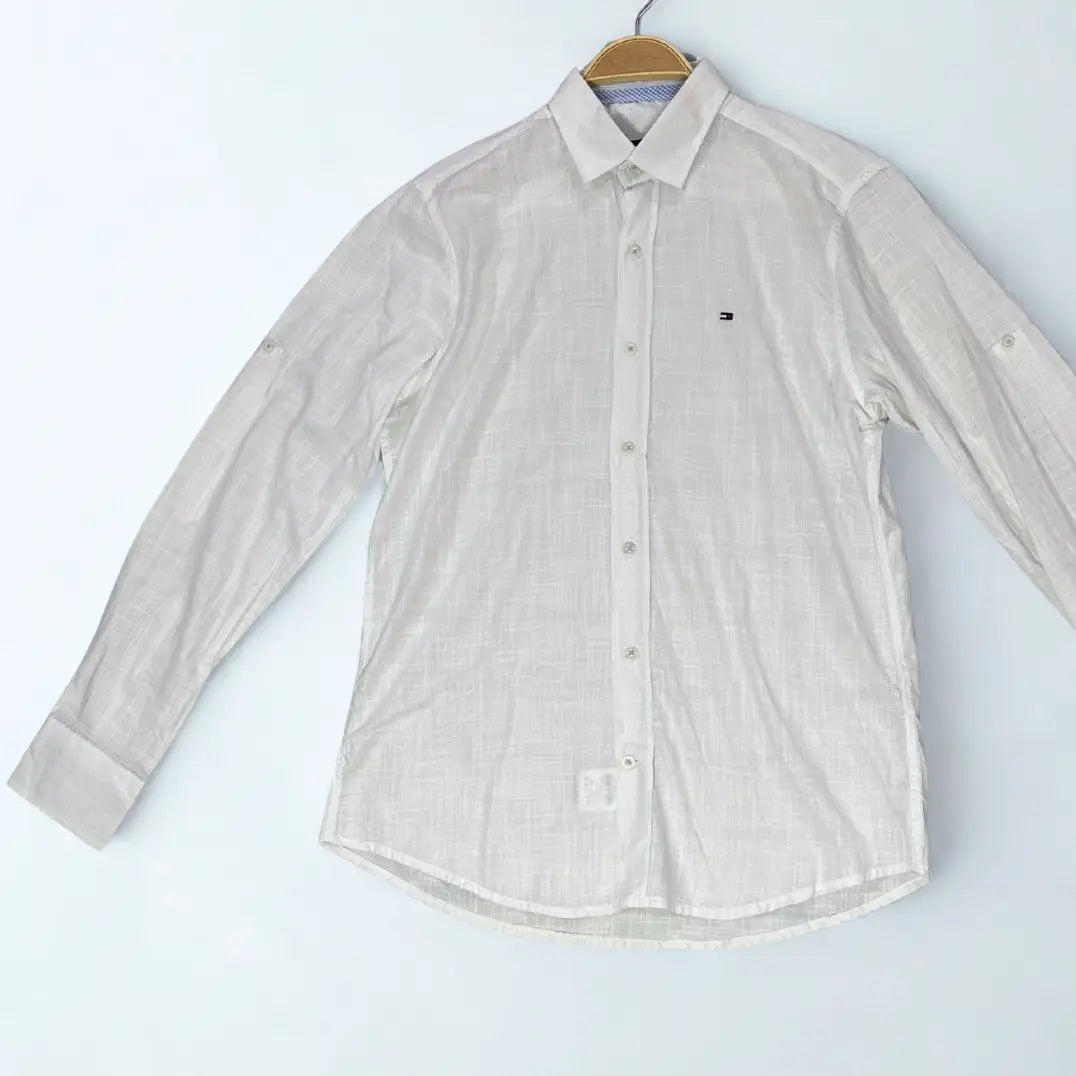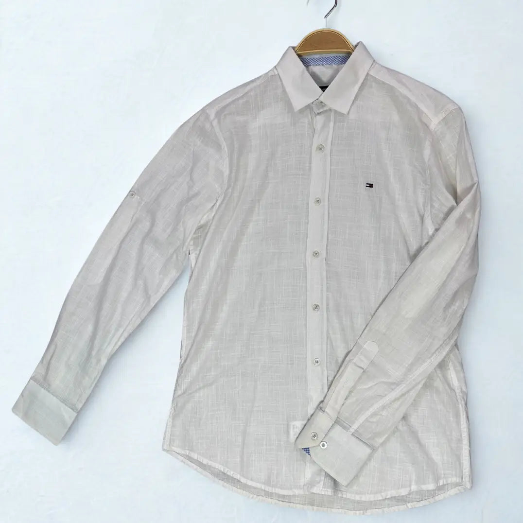 This is a refined and lightweight long-sleeve shirt by Tommy Hilfiger. It is crafted from a beautiful, off-white or light cream colored fabric, likely a linen or linen-blend, which gives it a breathable and textured appearance perfect for warmer weather.