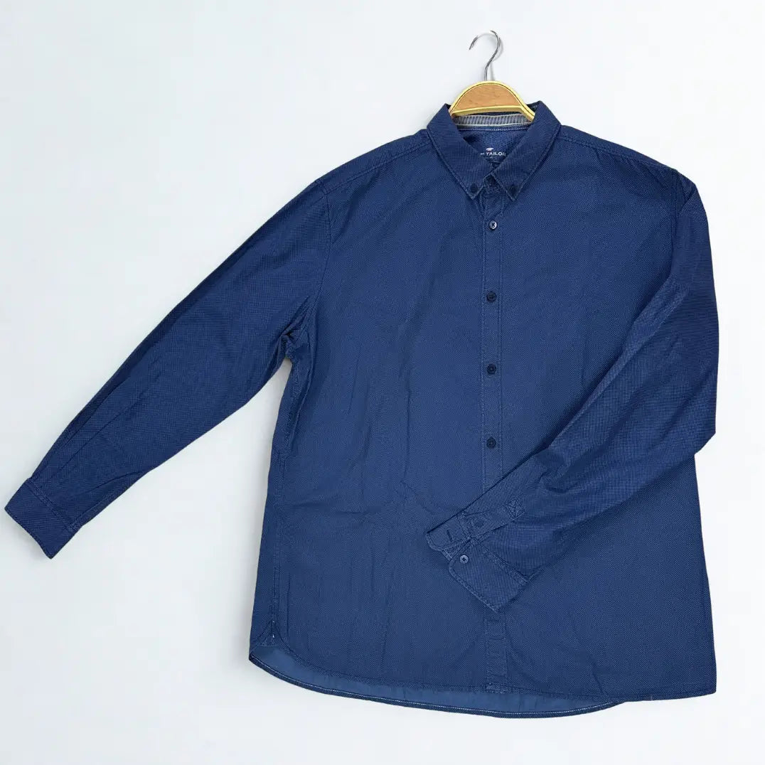 This is a stylish and modern long-sleeve shirt by Tom Tailor. It comes in a handsome shade of blue and features a subtle, all-over geometric micro-print (dobby weave) that adds texture and depth to the design.